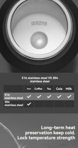 1.316 stainless steel, corrosion resistance, material safety, BPA-free, no odour. 3.